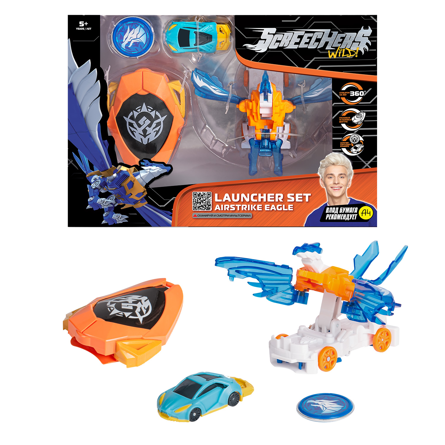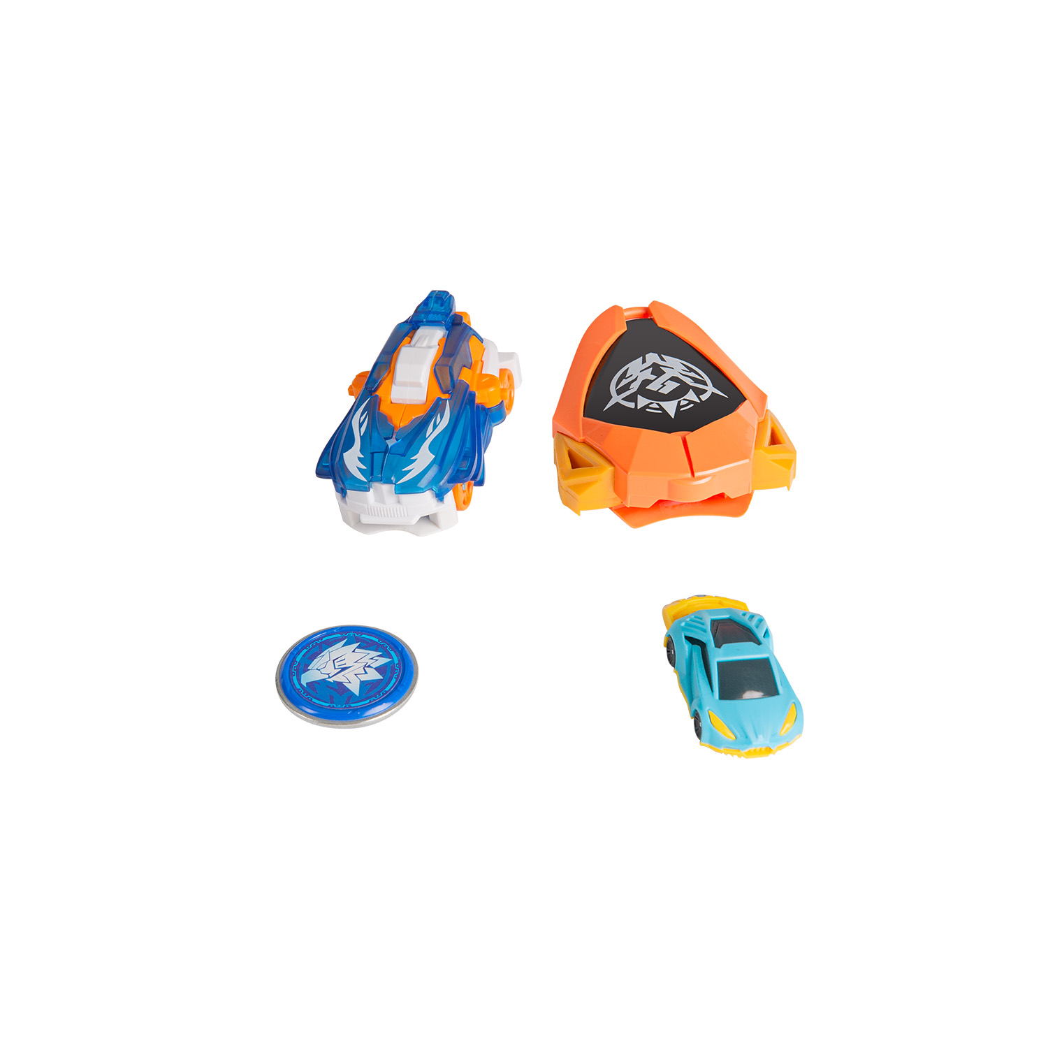 В набор входит машинка-трансформер (14х8х11 см), лончер, энергетический диск, скричер-кар, инструкция. Игрушка упакована в коробку с окном 27х19х10 см.