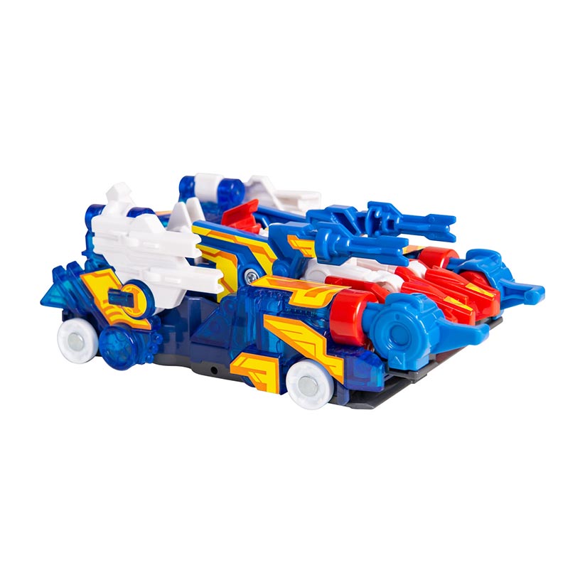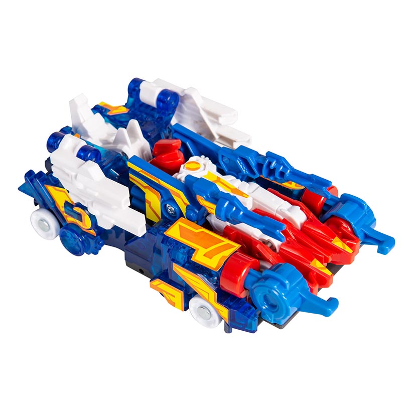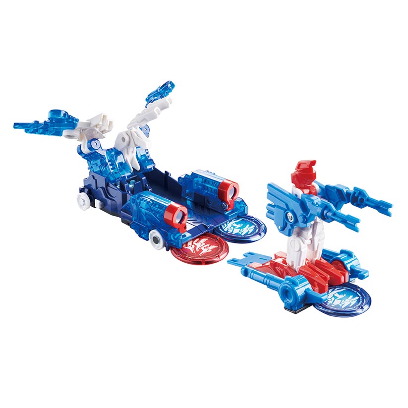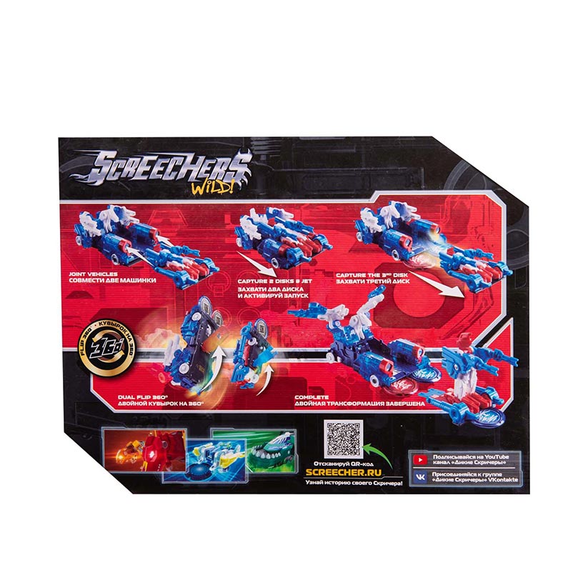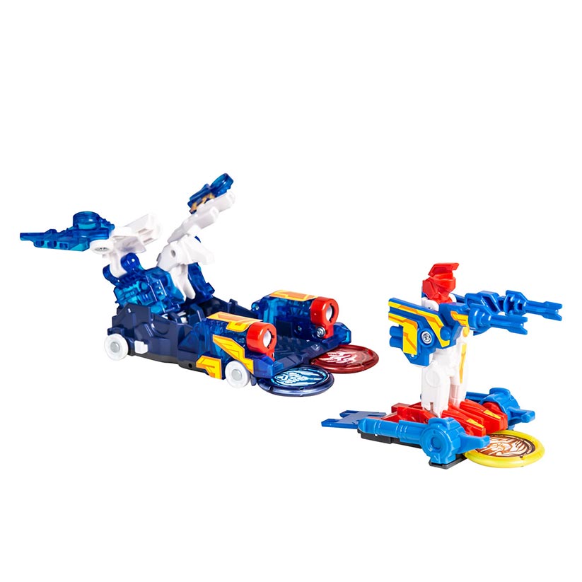 В игровой набор входит две машинки сразу – одна из них захватывает два диска, катапультирует вторую машинку, и они одновременно трансформируются прямо в воздухе!